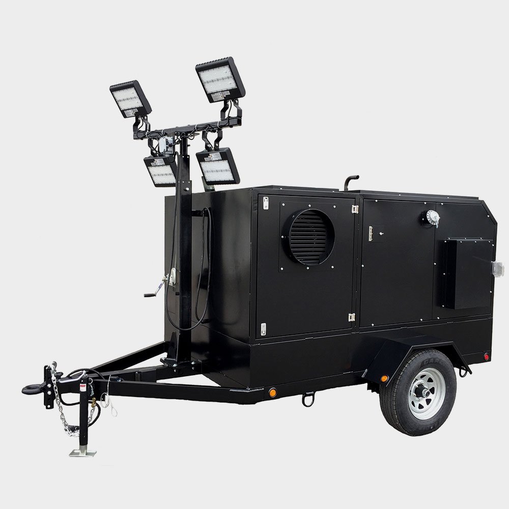 The FVO-400LTRC is a portable 3-in-1 heater trailer offering heat, lighting, and power generation for tough environments like construction sites and remote locations. It features a Flagro 400RC indirect-fired heater with a 16-gauge stainless steel heat exchanger, two 12-inch duct outlets, and one 16-inch inlet for efficient heat distribution. With a 390,000 BTU heating output, 8kW generator, and 15-foot light tower, it ensures smooth operation. A 300-gallon fuel tank and 4,000 CFM air circulation provide continuous performance, and the single axle with 15-inch rims, safety chains, and a 3-inch pintle hitch makes it easy to tow and set up.